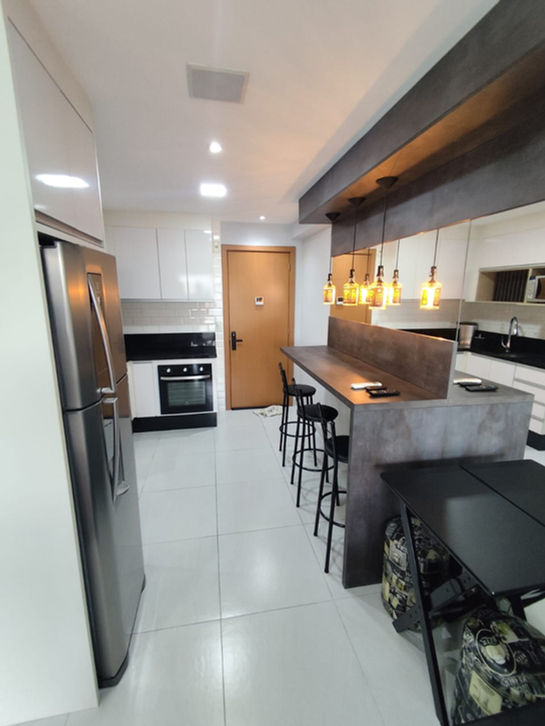Cozinha completa: micro-ondas, cooktop de indução Fischer, forno elétrico e refrigerador Electrolux